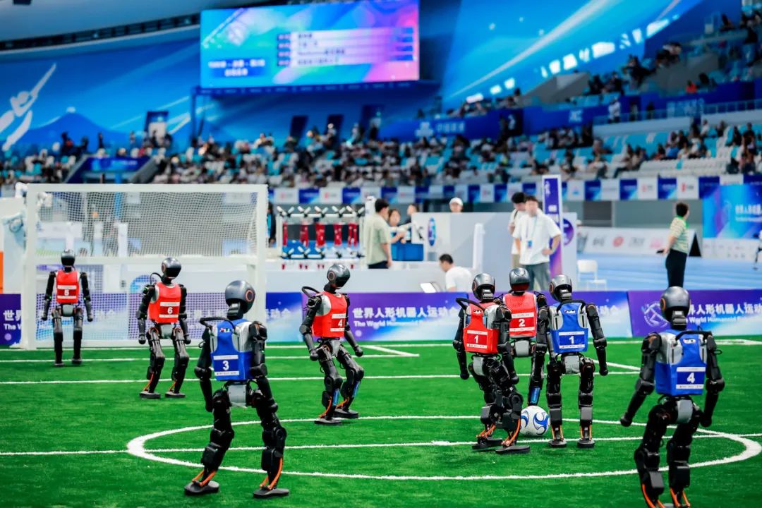 在绿茵场上,全球首创的全自主5V5足球赛激战正酣。1米出头的机器人身着红色或蓝色球衣,分别扮演着守门员、中锋或前锋的角色,排开不同阵型。过人、长传、射门……10名机器人球员在没有任何人工操作下激烈对抗。